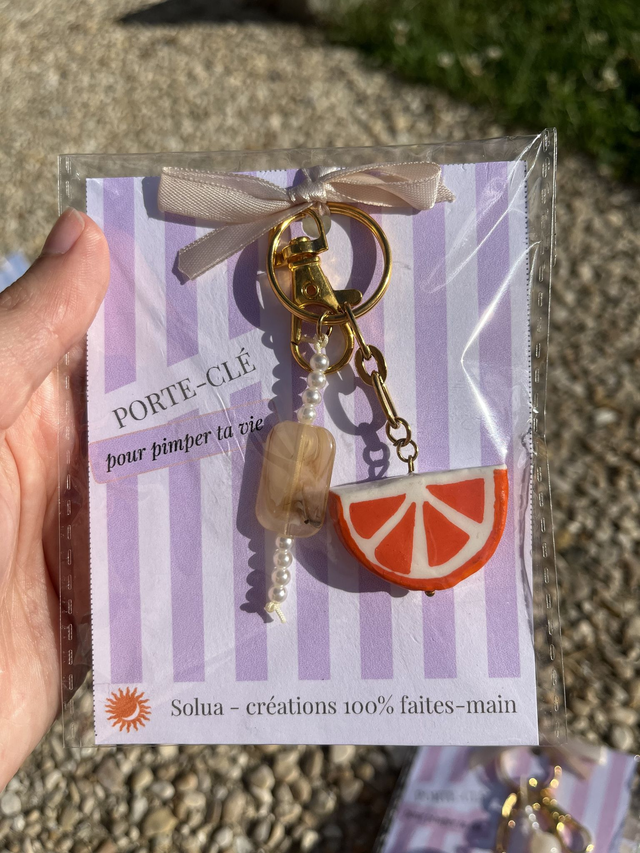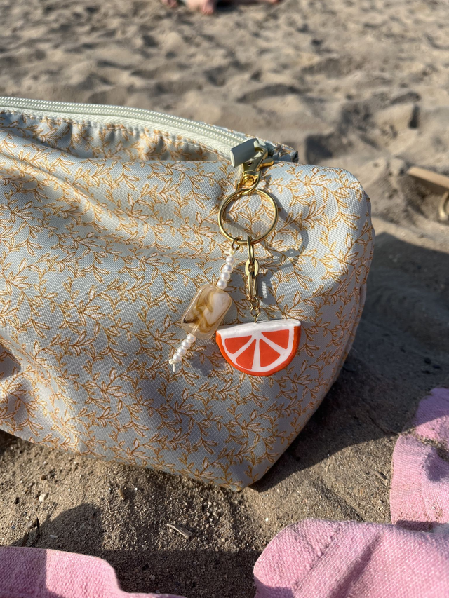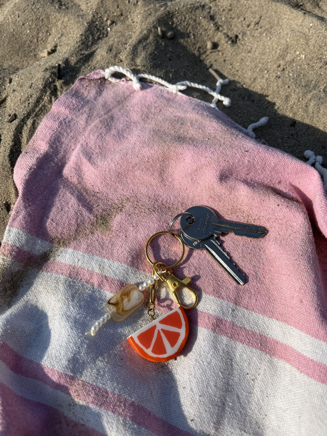 Énergie et bonne humeur garanties avec ce porte-clé doré orné d’une demi-tranche d’orange en argile et d’un grigri vitaminé en perles. Parfait pour ajouter une touche fruitée à ton été !